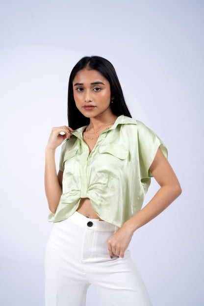 This satin blouse features an elegant loop knot detail and a cropped silhouette, crafted from luxurious silk fabric. Perfectly blending style and comfort.